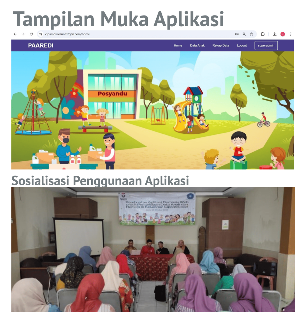 Data anak dan remaja sangat penting untuk menunjang terlaksananya program PKK dalam memantau pertumbuhan anak dan remaja, memastikan mereka tumbuh sehat, cukup gizi, dan memperoleh pendidikan yang baik. Dalam praktek di lapangan, pendataan biasanya dilakukan secara manual, dicatat di kertas, dan sebagian tercatat secara elektronik misalnya dalam format MS Excel. Hal ini tidak praktis dan membutuhkan lebih banyak waktu untuk perekapan dan penyajian data secara deskriptif. Untuk mempermudah aktivitas ini, aplikasi berbasis web dibuat untuk membantu mengelola data ini. Aplikasi berbasis web ini dirancang sedemikian sehingga dapat diakses dengan nyaman melalui browser di perangkat mobile maupun desktop. Kader PKK dapat menggunakan aplikasi ini secara langsung tanpa menginstal aplikasi apapun. Aplikasi ini dibangun untuk memudahkan para kader PKK dalam menginput dan mengelola data anak dan remaja di lingkungan RW masing masing. Saat ini lebih dari 6000 data anak dan remaja telah dikelola melalui aplikasi ini. Kelompok kerja PKK terkait di kelurahan Cipamokolan dapat melakukan pemantauan dan menganalisis data secara realtime.