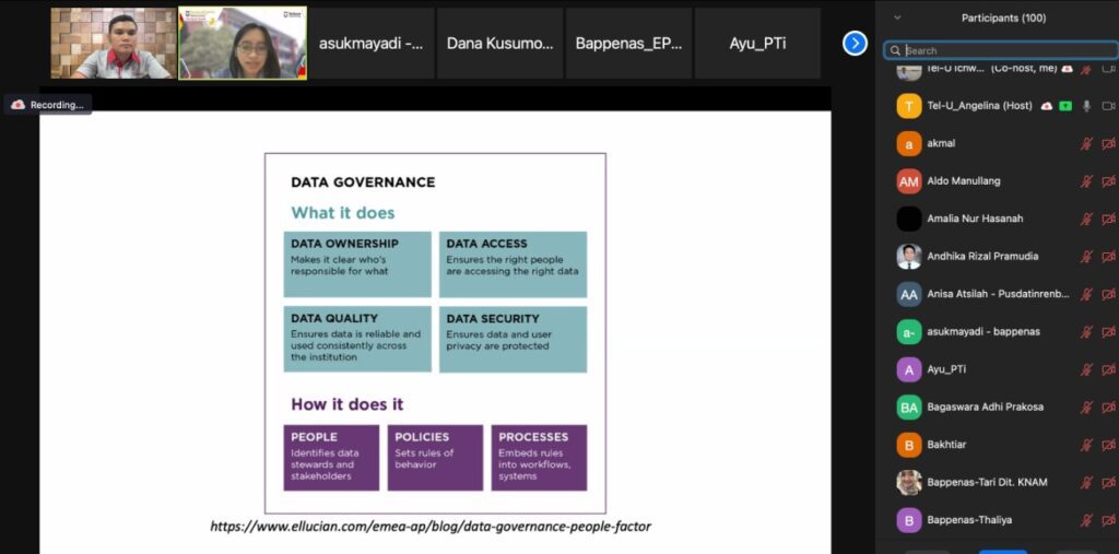 Knowledge sharing tersebut menyampaikan topik data management dalam 3 sesi: (1) DAMA- Body of Knowledge, (2) People factor, (3) Data governance. Tak kurang dari 100 peserta mengikuti pemaparan materi dan diskusi dengan antusias. Dalam sesi diskusi telah dibahas juga kondisi terkini pengelolaan data di Bappenas serta kaitannya dengan SPBE Nasional dan inisiatif Satu Data Indonesia.
