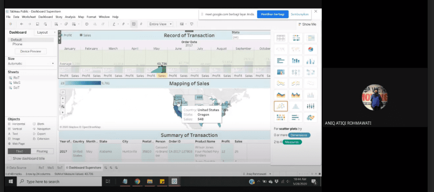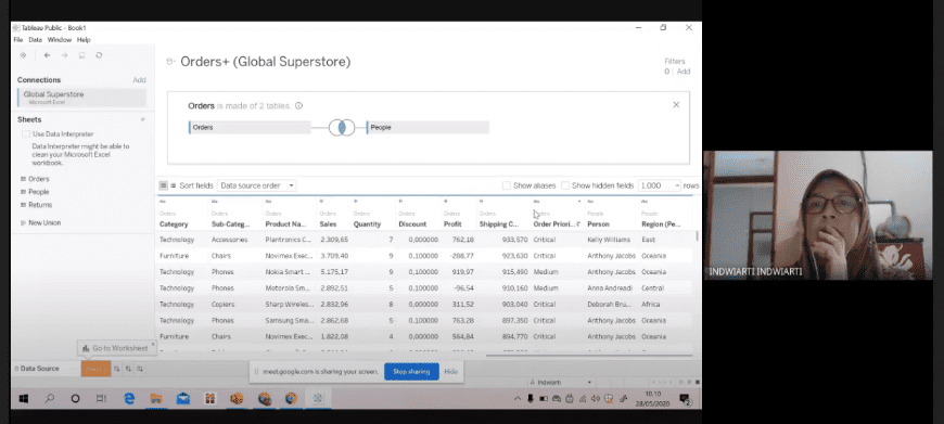 Mengingat situasi pandemi COVID-19, pelatihan visualisasi big data menggunakan Tableau dilaksanakan secara daring melaui aplikasi Google Meet pada 28 Mei 2020. Peserta pelatihan berjumlah 21 orang guru SMKN 3 Bandung, yang sebagian besar merupakan guru dari Jurusan Administrasi Perkantoran dan Jurusan Pemasaran. Pelatihan diselenggarakan dalam 2 sesi, sesi 1 pada jam 8.00 sd 10.00, sementara sesi 2 dilaksanakan pada jam 10.00 sd 12.00. Link video pelatihan dapat dilihat di https://drive.google.com/file/d/1ai644BPQ8fGjP5aGovLaa-Hf1FFO4OW4/view