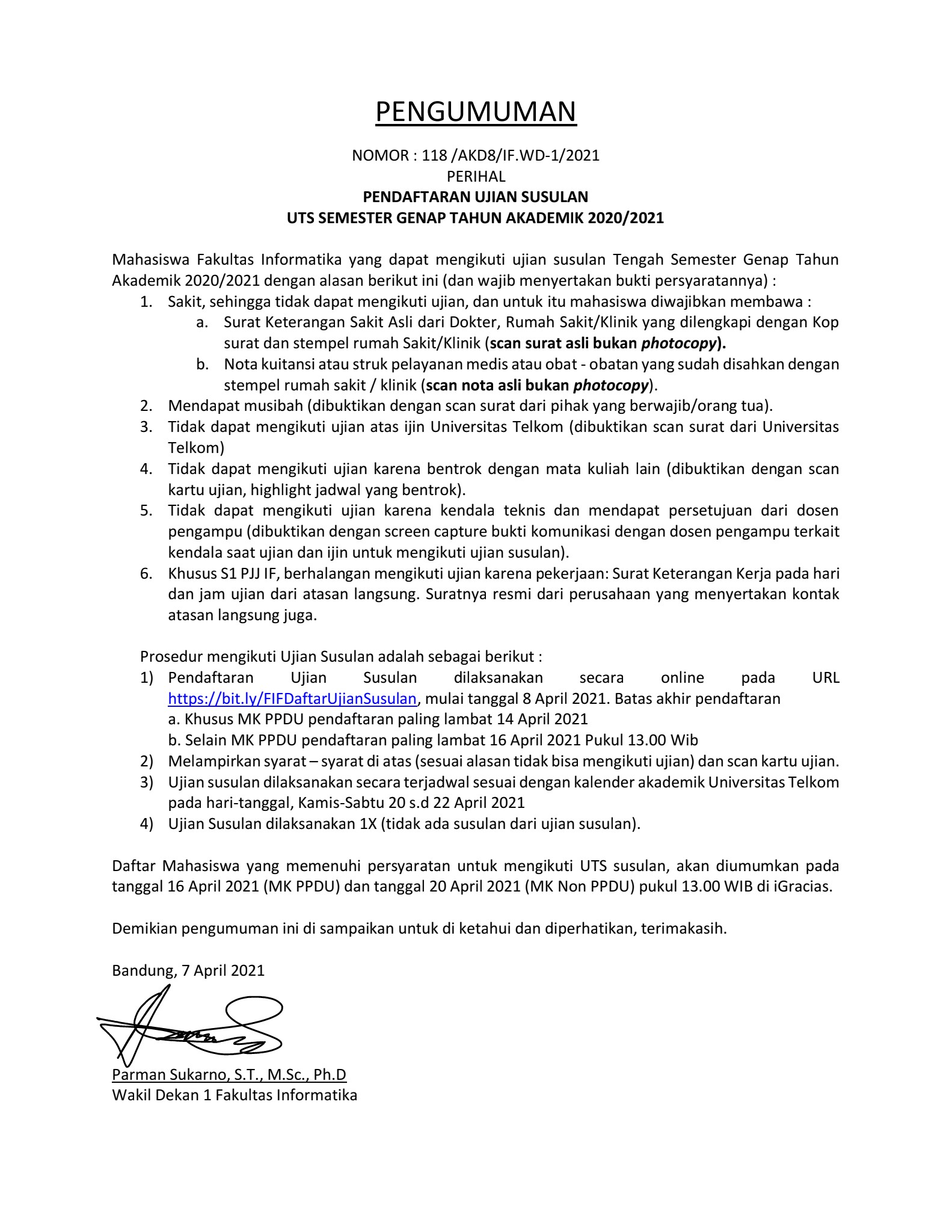 PENGUMUMAN UJIAN SUSULAN UTS 2020-2021-2 FAKULTAS INFORMATIKA By | 7 April 2021 | Informasi . Informasi Akademik | 0 Comments |